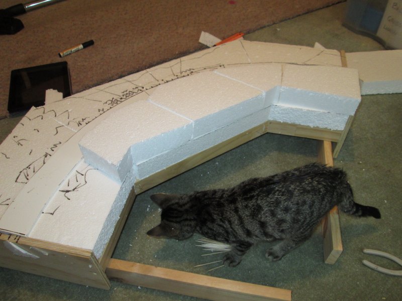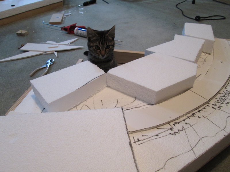 I already had the base made, so I cut out a piece of foamcore for the track to sit on then started cutting polystyrene to fit. Tiger decided to help me out a bit.