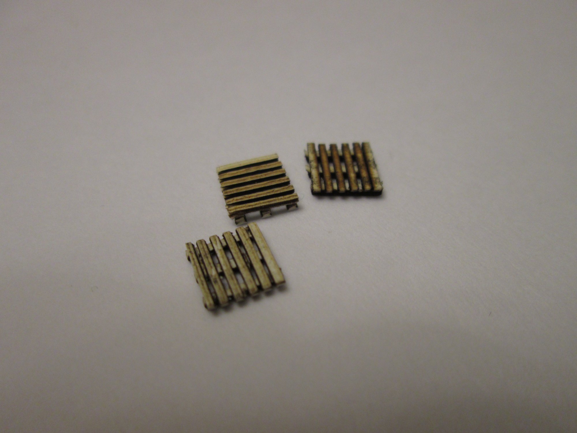 These are straight off the laser with no paint, though the singed look is remarkably realistic, and the dark edges give them good depth. These are made as a lamination of two pieces of cardboard; thicker card for the base, and thinner card for the top. Simply take the two squares, glue them at right angles, then once dry use a sharp knife to cut along half-etched cutting guides. Four cuts later and you a perfect shipping pallet.
