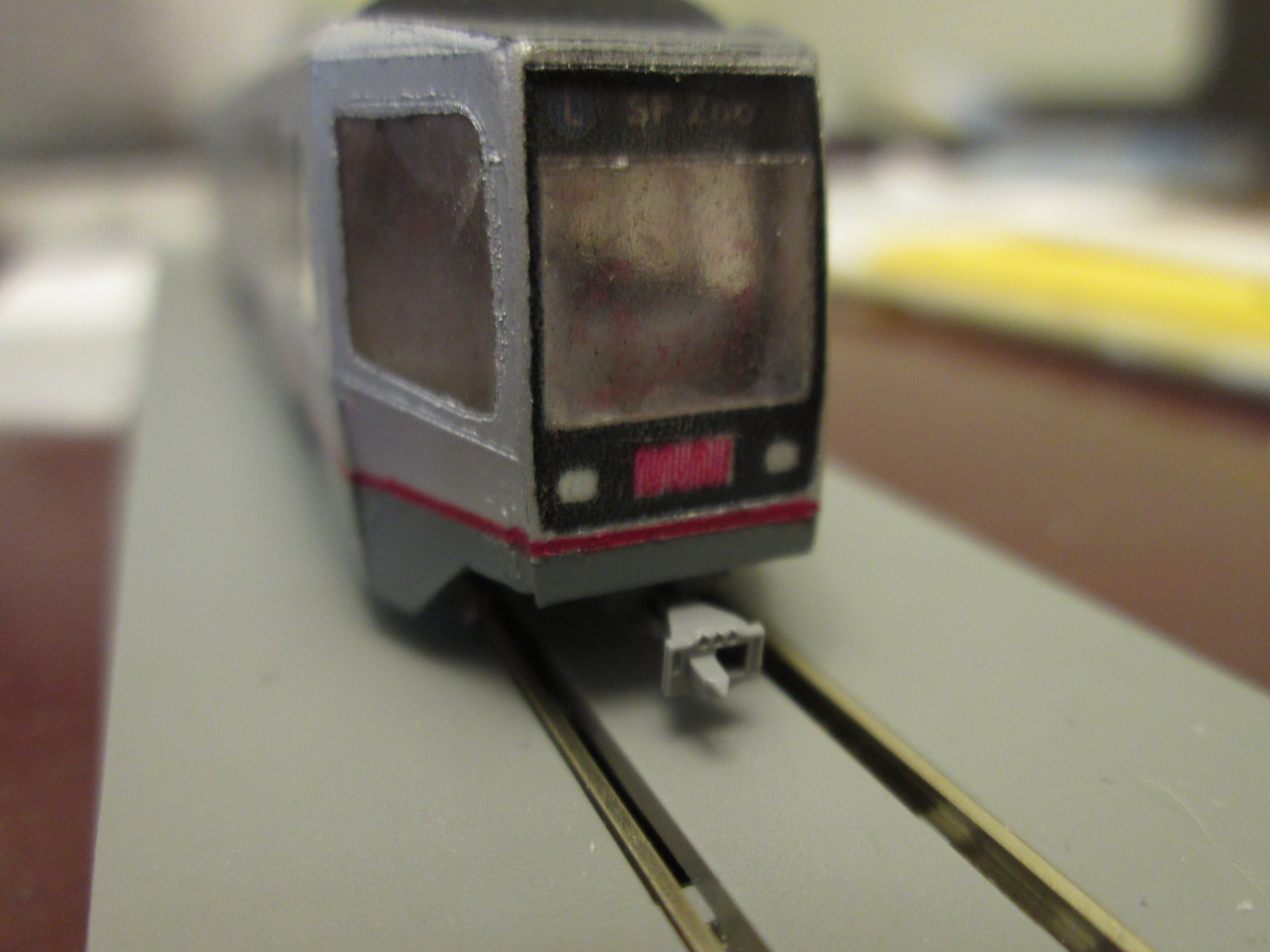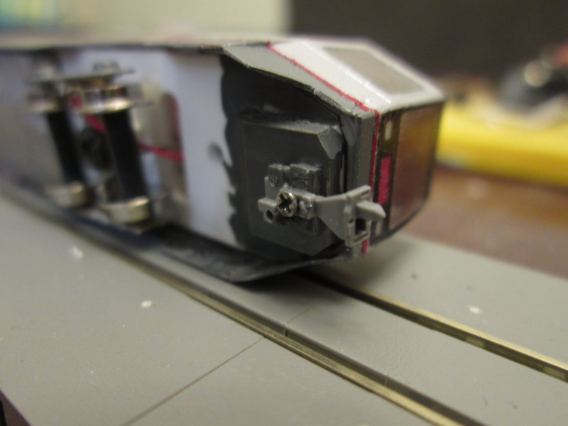 My LRV is very nearly finished. One thing I felt it was missing were some couplings. I had some Kato 11-704 couplers which are just the right style for a light rail vehicle. I very carefully built up some supports for them out of styrene, only to discover the they needed to be lower. So I made them lower to clear the body, only to find they now fouled the rail..!! So I did some more tweaking, in the end I just drilled a small hole and used an M1.4 self tapping screw to hold it in place. Works really well! Those 1.4mm screws are very handy, I bought a 200 of them off eBay for a fiver.