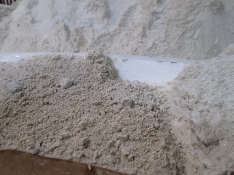 Correcting this mistake, I made a new paste consisting of: "Deck and Pave Grip" (very very fine sand), acrylic modeling paste, water. Mixing these together made a nice gritty paste that I used to cover the polystyrene and blend the rocks into the scene. This worked well.