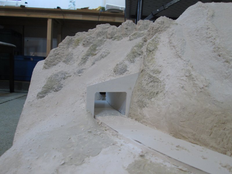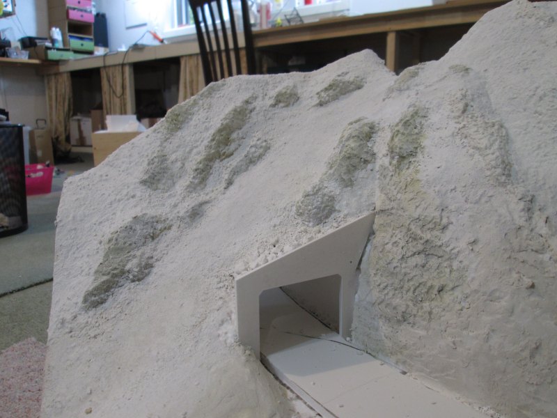I also decided there weren't enough rocks, so I added more around the middle of the scene. Then I added more to the right of the scene, more around the tunnel, extended other rocks, filled in holes, etc. For several hours I would mix up some plaster, scoop it onto the scene, roughly shape it, run off and clean the mixing cup of plaster, rush back and by now the plaster would just about be ready to carve. Then for the next 15 minutes I'd carve it. Rinse and repeat for half a bag of plaster.