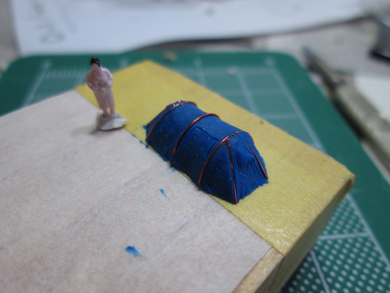 I made the master for my tent from plasticine, forming it with a scalpel. The poles were made from very thin wire, shaped around a pen barrel. I used an N scale figure (who appears to be wearing a dressing gown?) to get the scale about right. I modeled it after my own little blue tent.