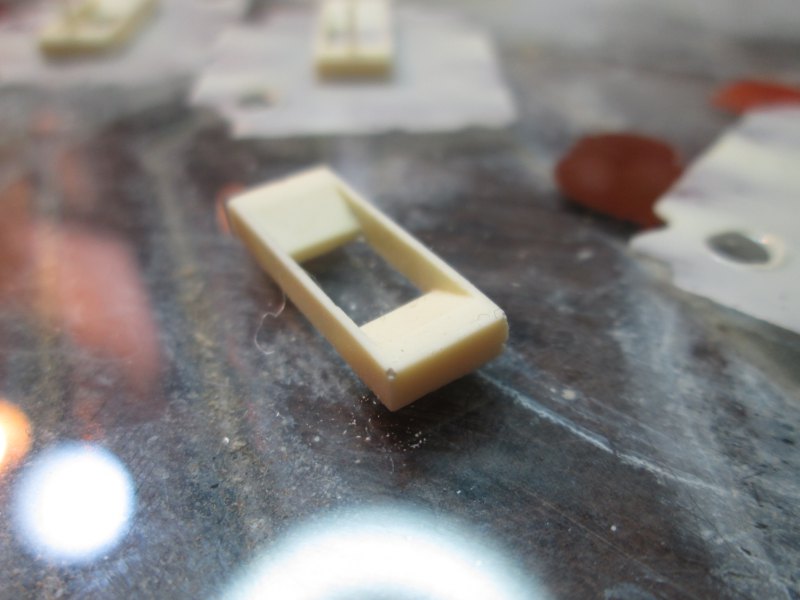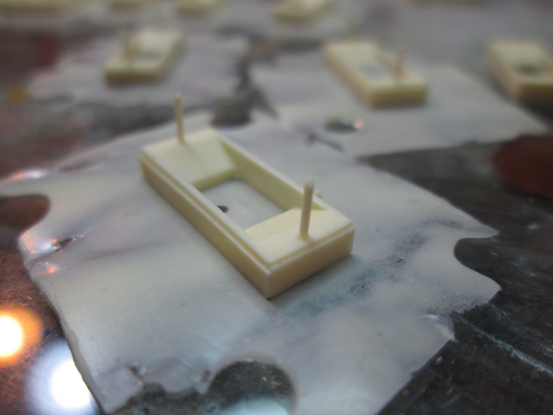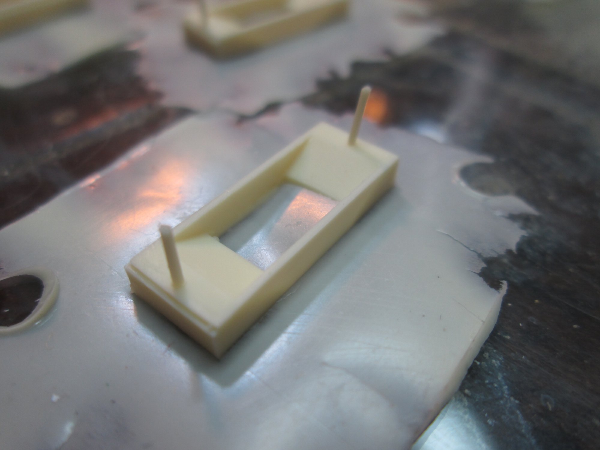 To get rid of these took very careful mixing, careful pouring, careful prodding in corners of the mold with toothpicks, and then a bucket load of luck. Out of about 20 castings, only 4 came out with no noticable air pockets in the corners; a rather poor success rate.