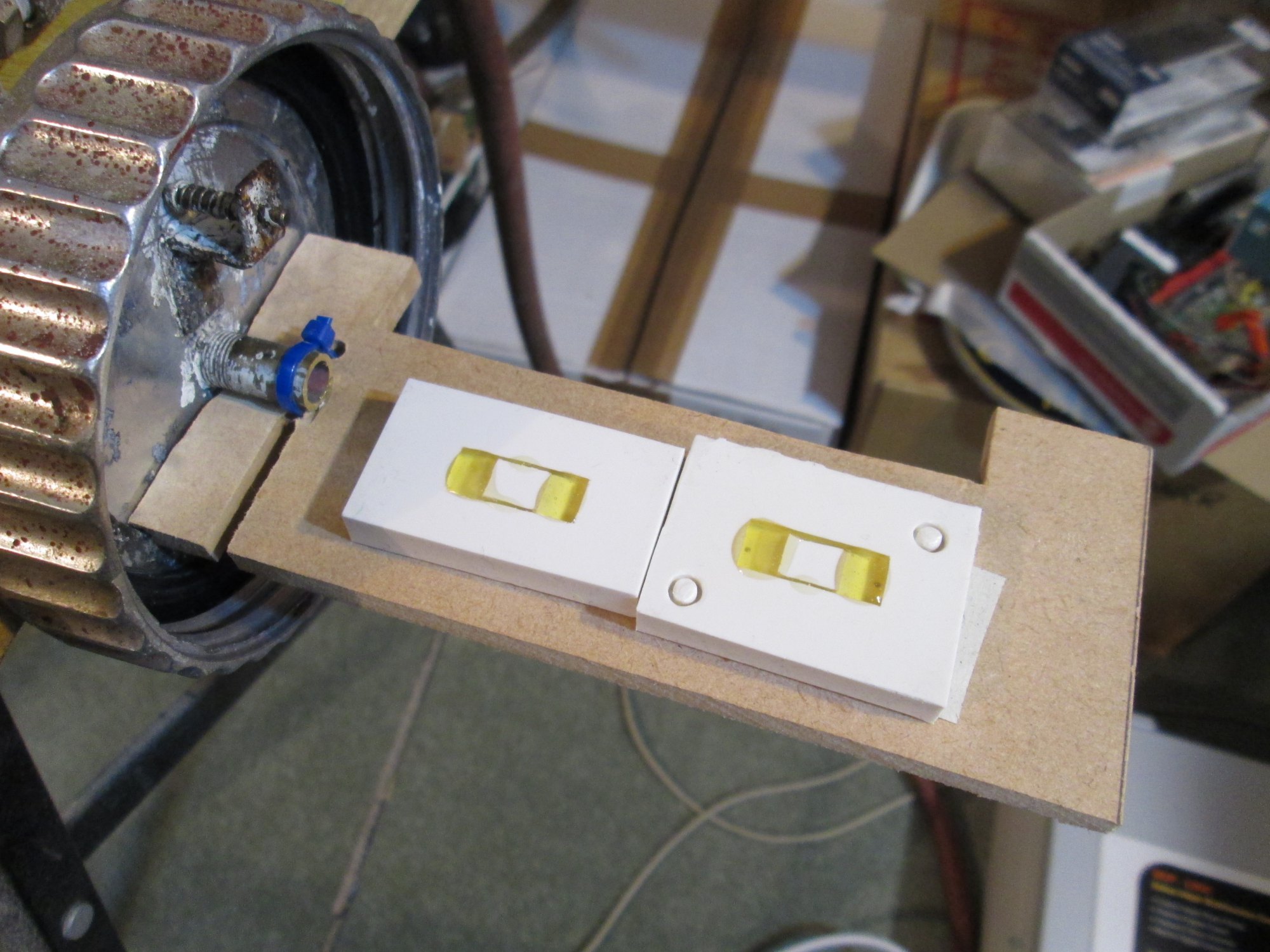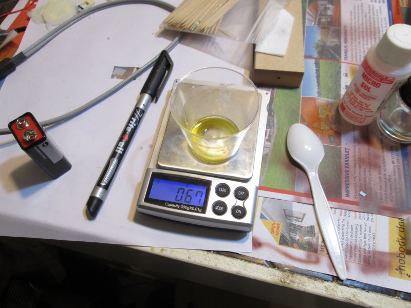 1) Mix up resin. I have some very accurate wee scales that measure down to 0.01g, or single drops of resin. As soon as you start mixing you have about 3 minutes before it sets solid.