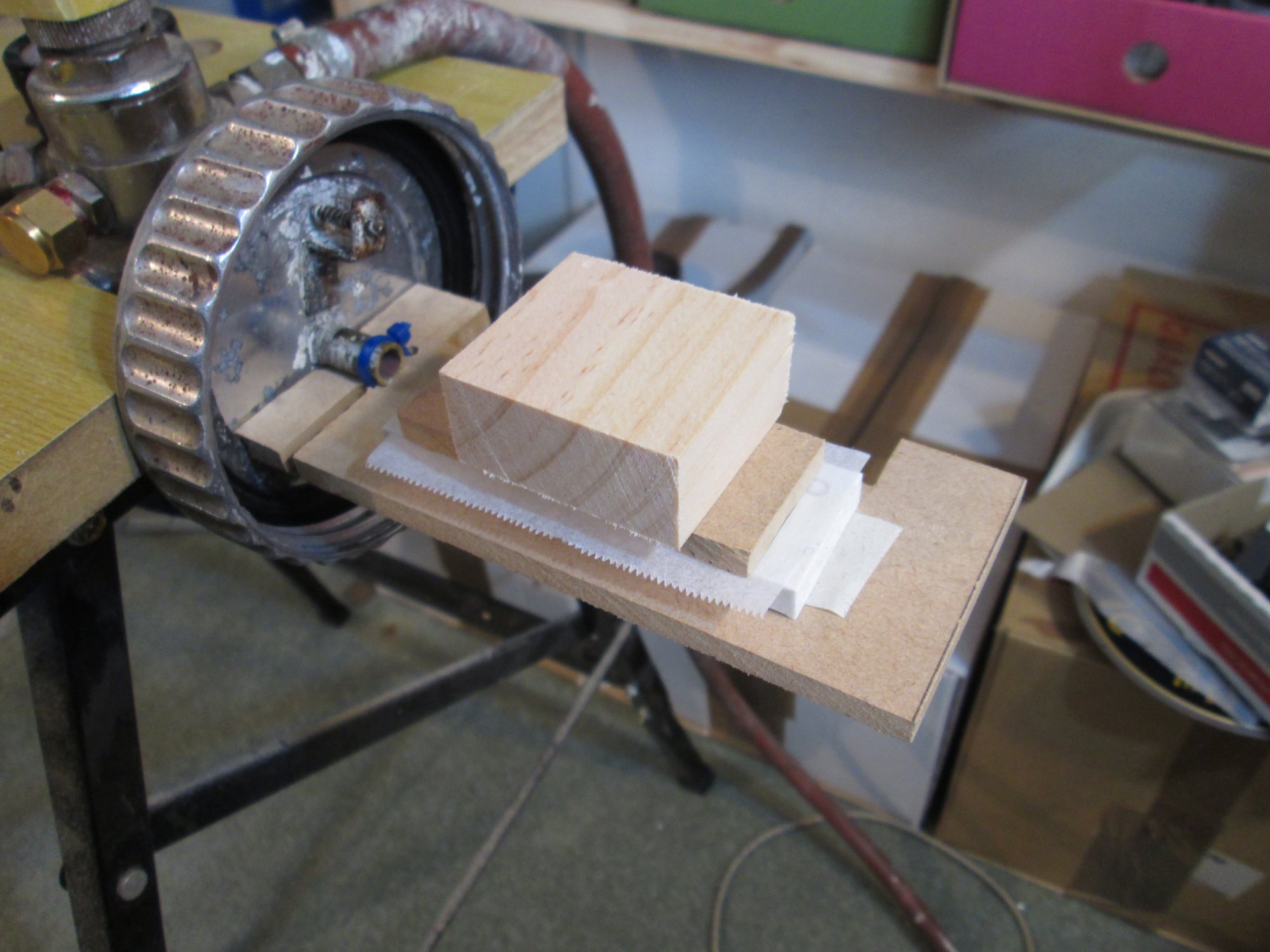 2) Pour into molds. I have the molds already sitting in position. I mounted the pressure pot horizontally on my WorkMate, and made a little platform to support my castings. This way they aren't disturbed as the pot is put on. At this stage I flex the molds and look for any large air holes.
