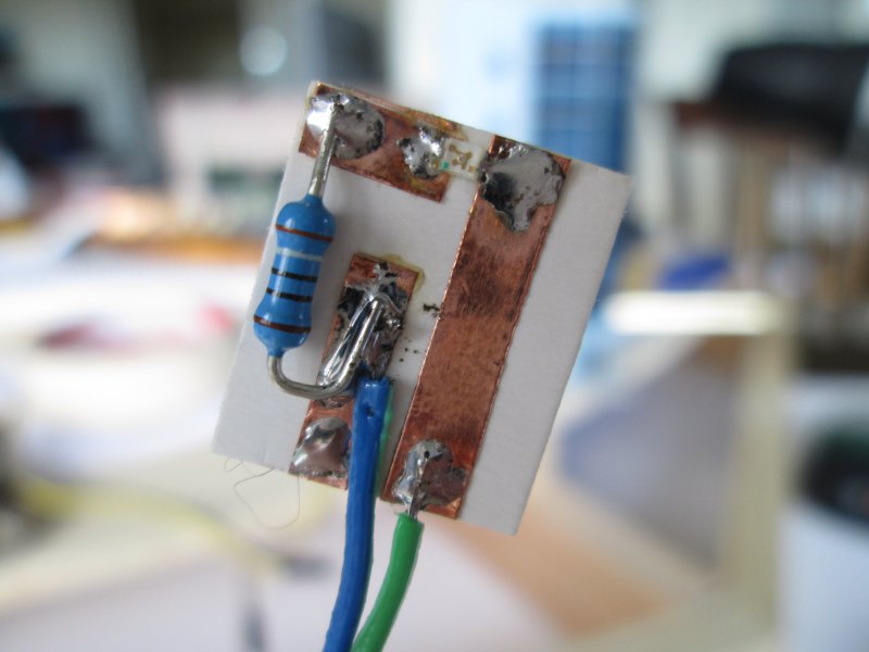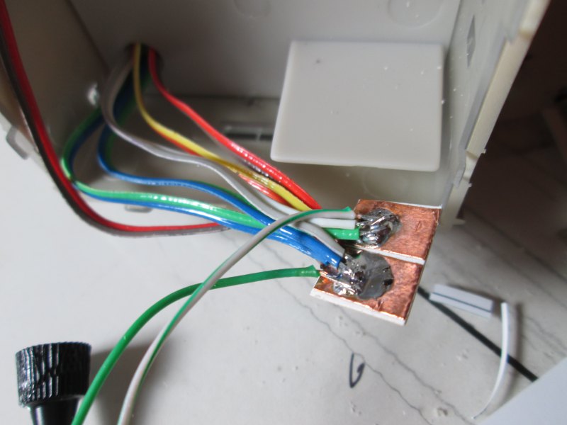 On the bottom floor I made a small circuit board to terminate the wires from each floor. It's just two strips of self adhesive copper tape on some cardboard, but it works pretty well.
