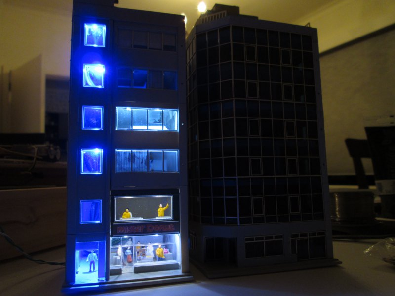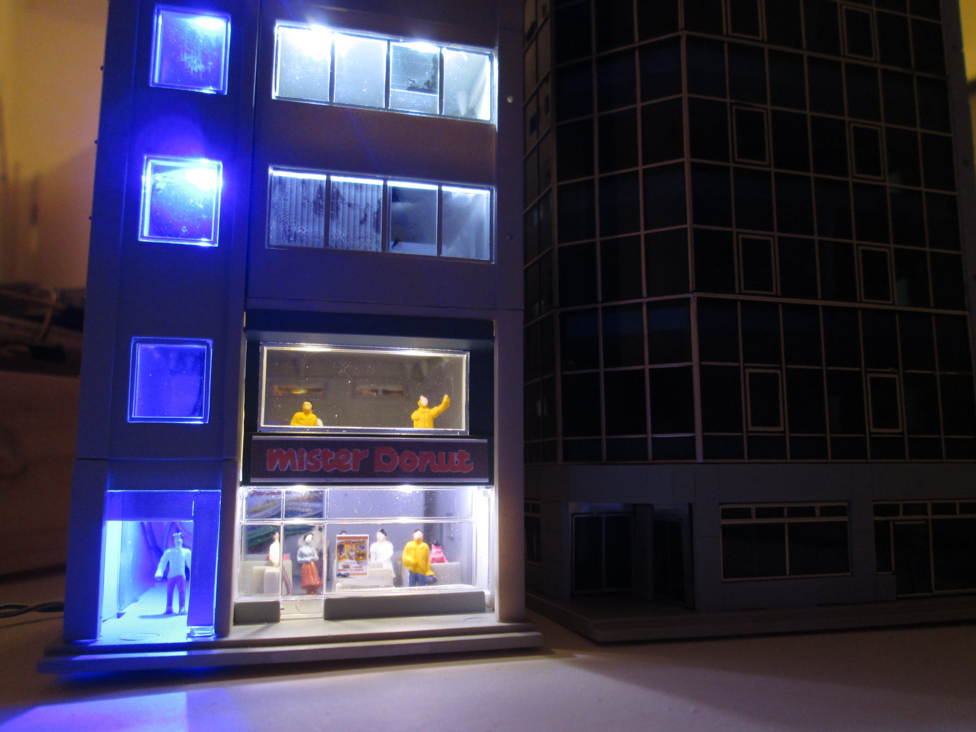 I quite like the finished result, but I think some fine tuning of the lights will be required. Some of the lights are too bright, and some of the blue ones need toning down. I would also like to see if I can make the Mister Donut sign illuminated. However for a first attempt I think it works pretty well, and will be adding lighting to the rest of my buildings too now. The difference compared to the unlit building on the right is impressive!