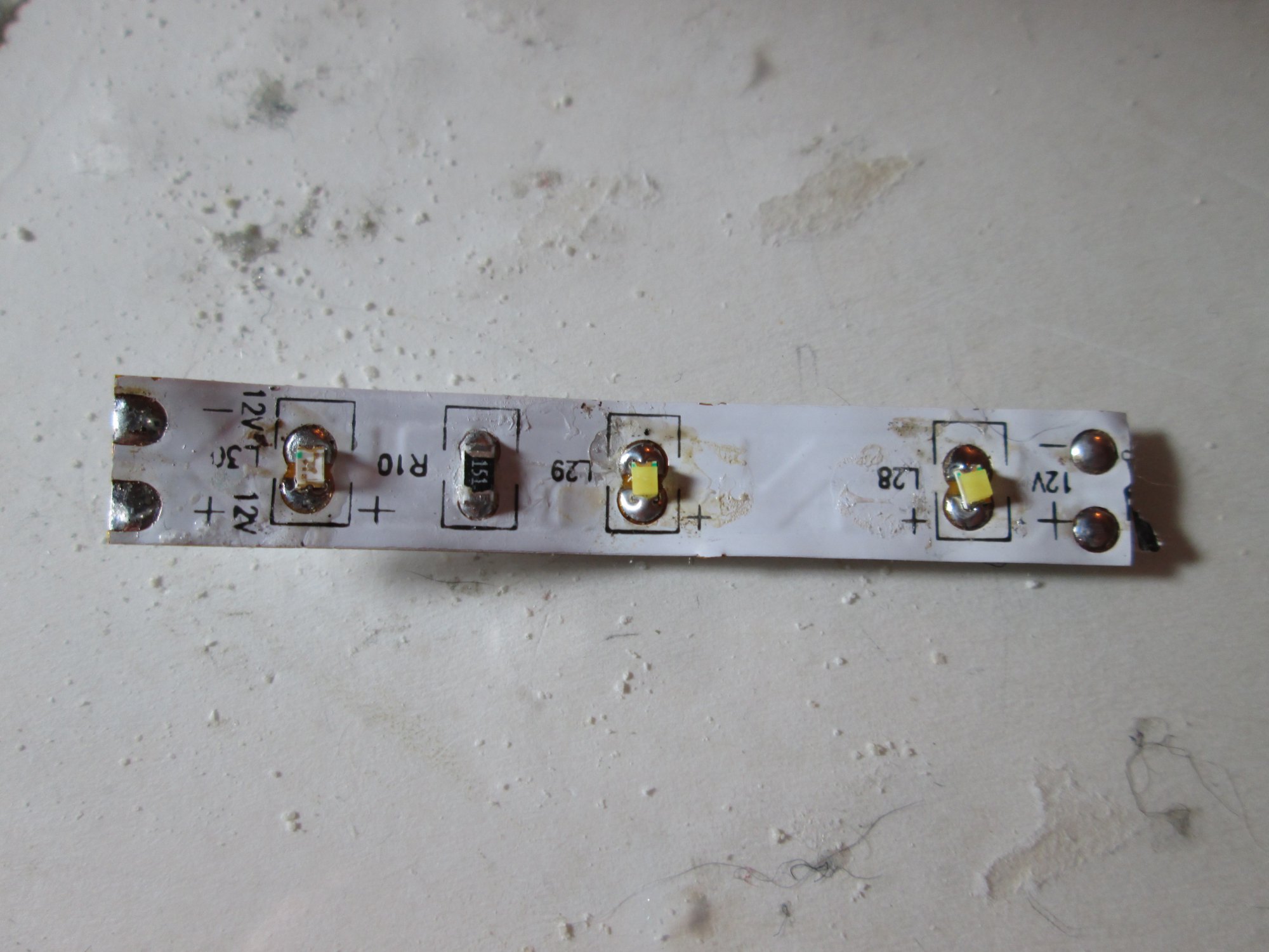 In between making points, I've been playing with some of my recently acquired buildings. I decided to tackle a small one initially to get the feel for things. First step was to dismantle the building, something Kato have made fairly easy. I dug out some LED strip tape, which unfortunately had green LEDs. It was a simple enough job however to desolder them and solder on some tiny replacement white LEDs.