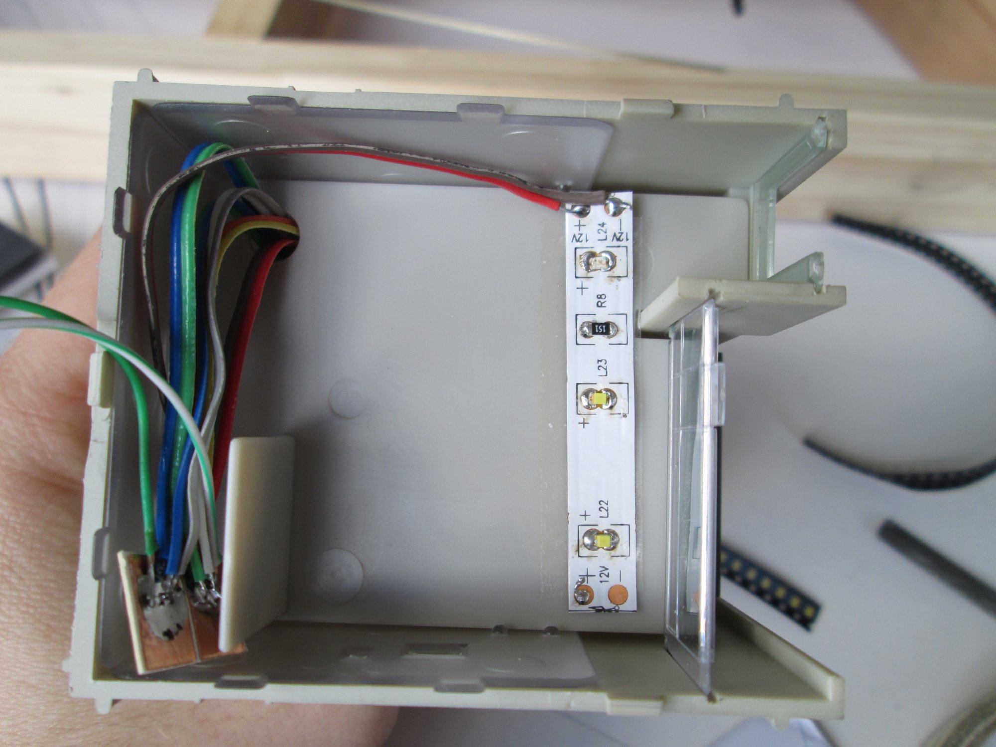While at it, I put some blue LEDs into the end spot so that the stairwell would be a different colour. Then I drilled holes and made space for the lights and mounted a row for each floor. Some more holes at the back to run the wires down.