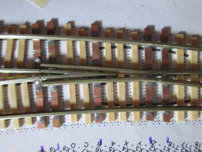 Sticking the turnouts to the sleepers proved challenging... since all the turnouts were now soldered together into one continuous run, there was a lot of bits to glue. I did a good job on one side, and a terrible job on the other – the superglue went everywhere and ended up solidly gluing half the turnout blades to the track. Hmm.