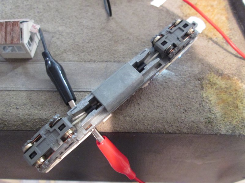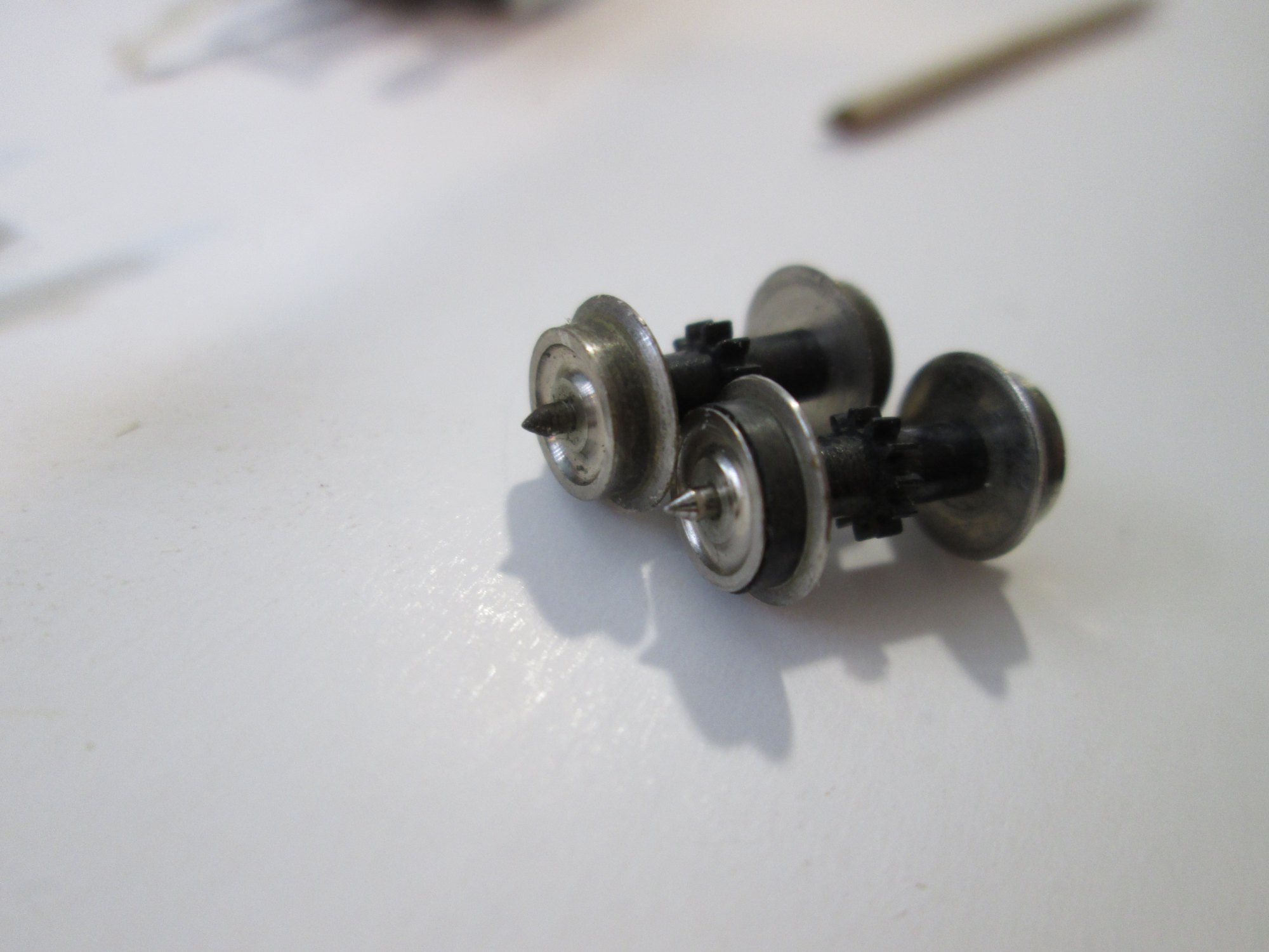 One wheel on each bogie is equipped with a traction tire, used to give the train extra grip, but unfortunately it reduces the number wheels collecting current to only 6. To clean the wheels I scraped off the tips of the axles, and tried to clean the threads with alcohol, meths, and then acetone, but none of them would budge the gunk. You can see the difference between the dirty and cleaned axle tips above.