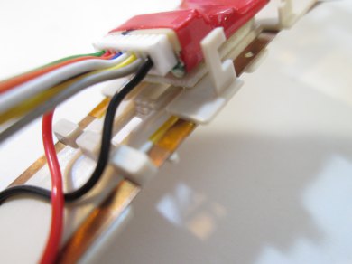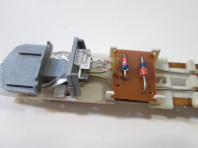 The light board was popped out, and the decider stuck down in its place with some foam tape. First two wires to attach were the power leads, read and black. The wiring diagram was specific about what colour should go where, but considering we're talking about DCC which is AC, I can't see it making any difference. I decided to follow along anyway. Before I did that though, I needed to insulate the the pickup strips from the motor tabs. This was done using some Kapton tape. Then I soldered the motor tabs to the decoder.