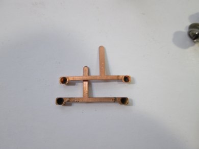 One was totally busted, the other permanently collapsed. The other end wasn't much better. Using a magnifying glass, very good lighting, and a pair of tweezers, I managed to wrestle the things back into place. Although hard to see, there are little plastic nubs, one on the centre arm, and one on the base. Amazingly nothing was actually broken and I was able to easily slip things back into place.