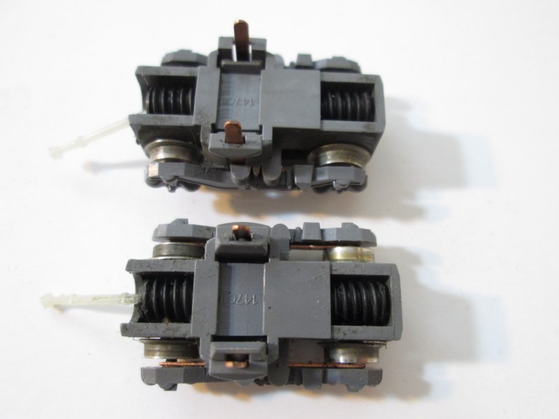 There was a fair amount of general dust, fluff, lint and gunk caught up in the bogies, so they received some attention at the same time. To dismantle them, press the two tabs inwards on the top of the bogie. I've started on the top bogie, while the bottom one is still untouched. You can also see the amount of grime on the poor bogies: