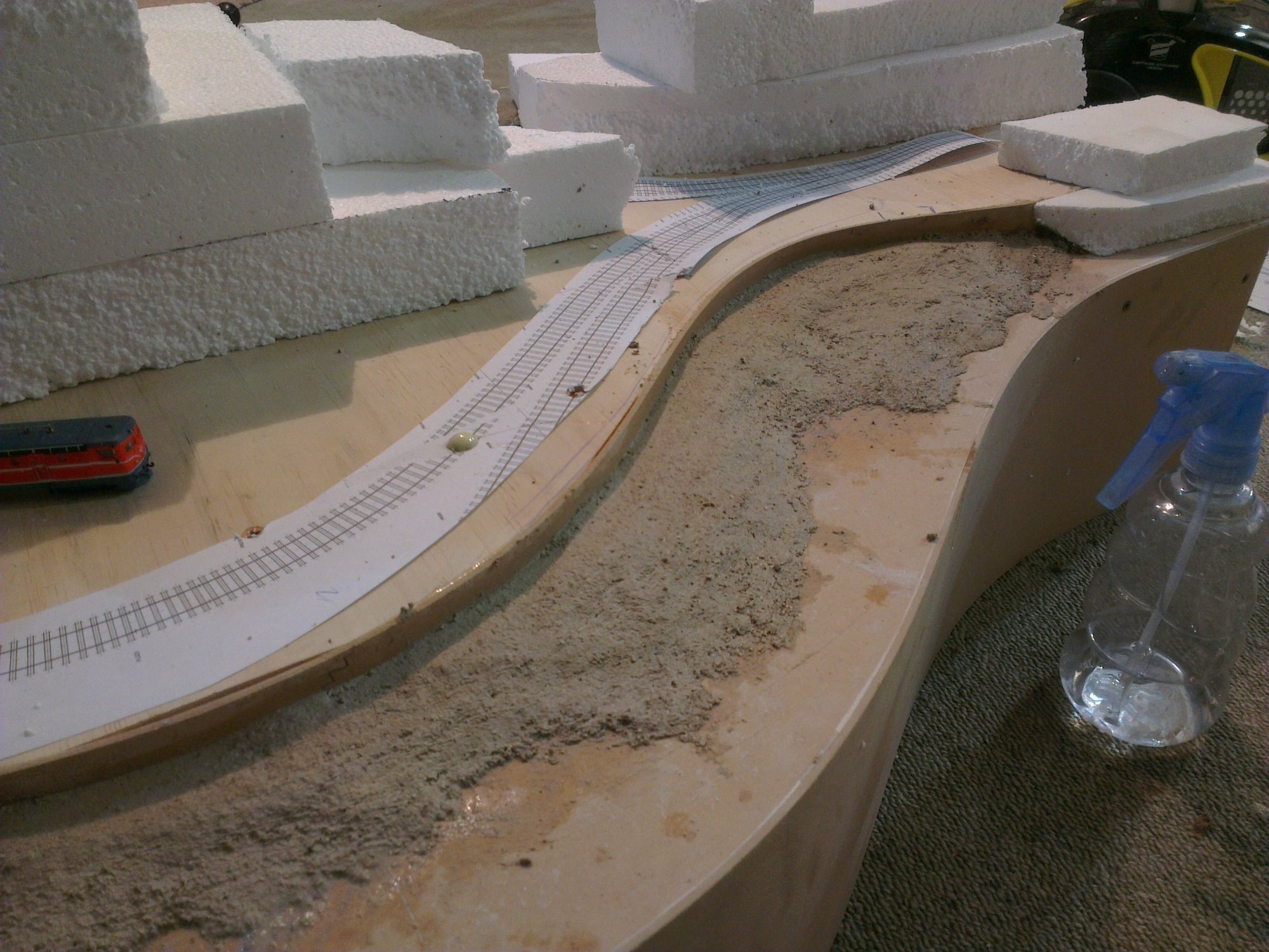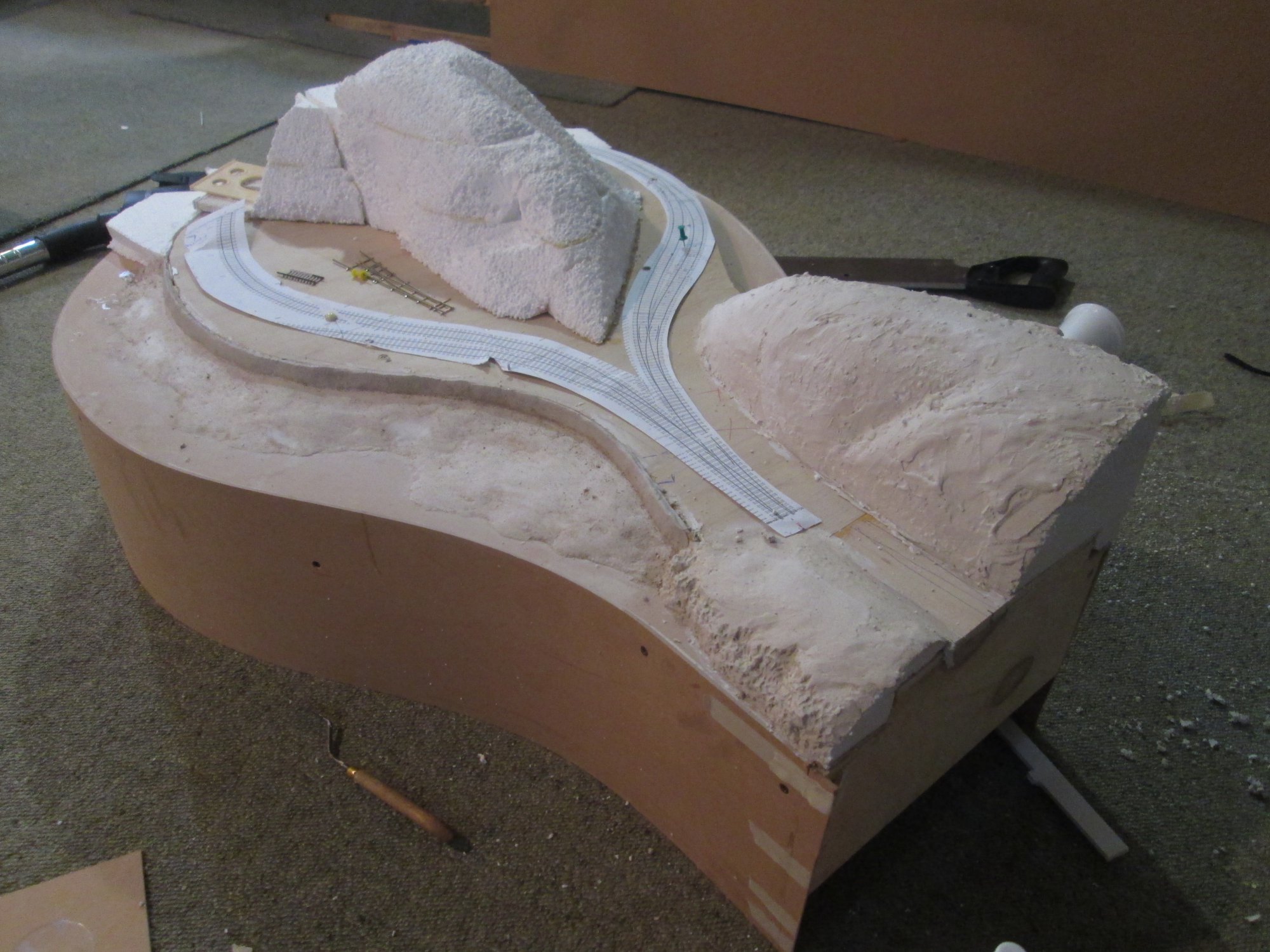 In the meantime track has been ordered, but has yet to arrive. Until the track is laid I am unable to complete the tunnel area so I am having to work on other areas. Today, I started adding plaster to the landforms. While at it I formed a few rocks around the sea boundary; these should look good with the sea lapping at their edges.