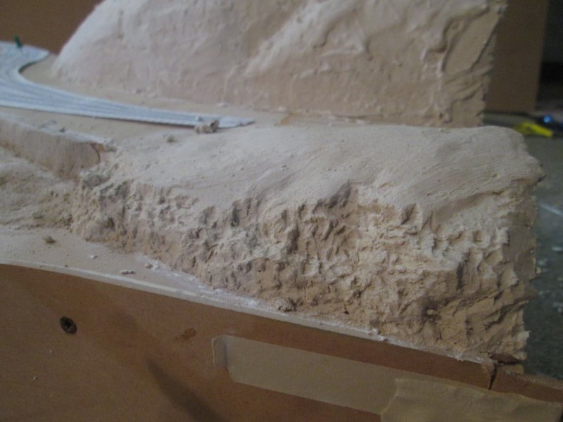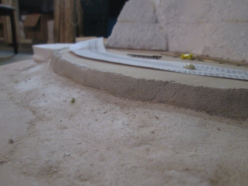 Around the beach are I added some foam core where the beach is to be. I then mixed up some very ancient Woodland Scenics Scultamold, which is a sort of lumpy plaster that keeps its shape, and isn't a rock hard dense as regular plaster.