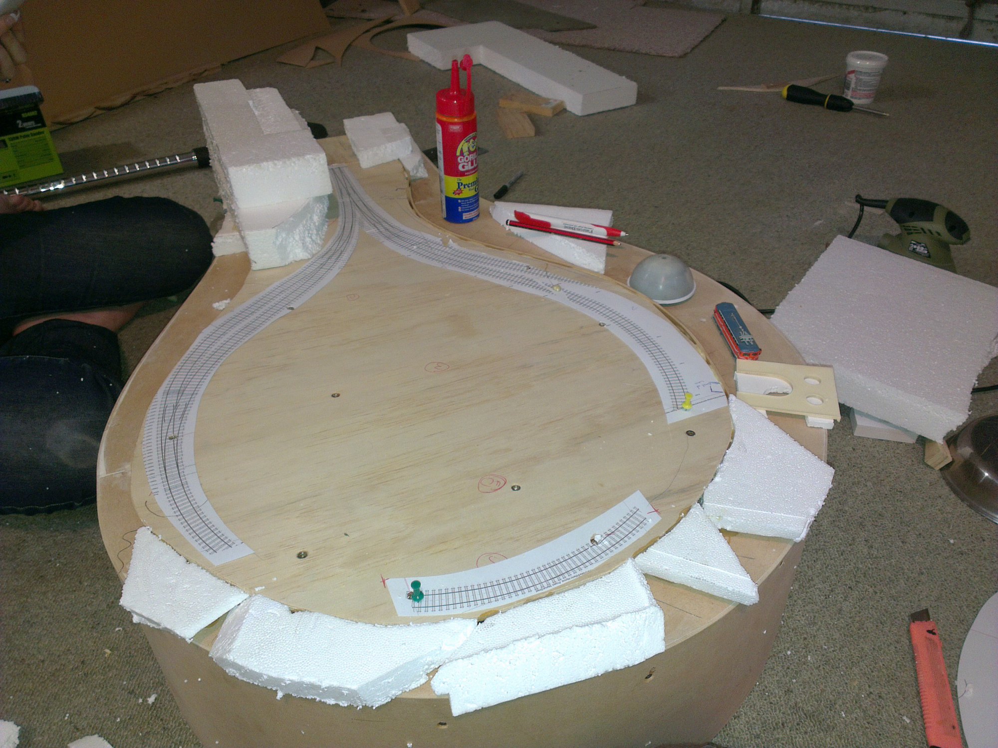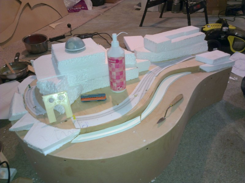 Some time later I contoured the polystyrene into land forms, using a saw, knife, and a Stanley Surform tool. All very messy work and there were polystyrene beads everywhere. However the land is now starting to take shape.