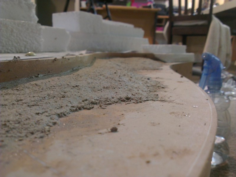 However progress is being made. With Rachel's help I've started building up the land forms. First off some scraps of foam were stuffed in the gap between sea level and land level to form a ring of rocks.