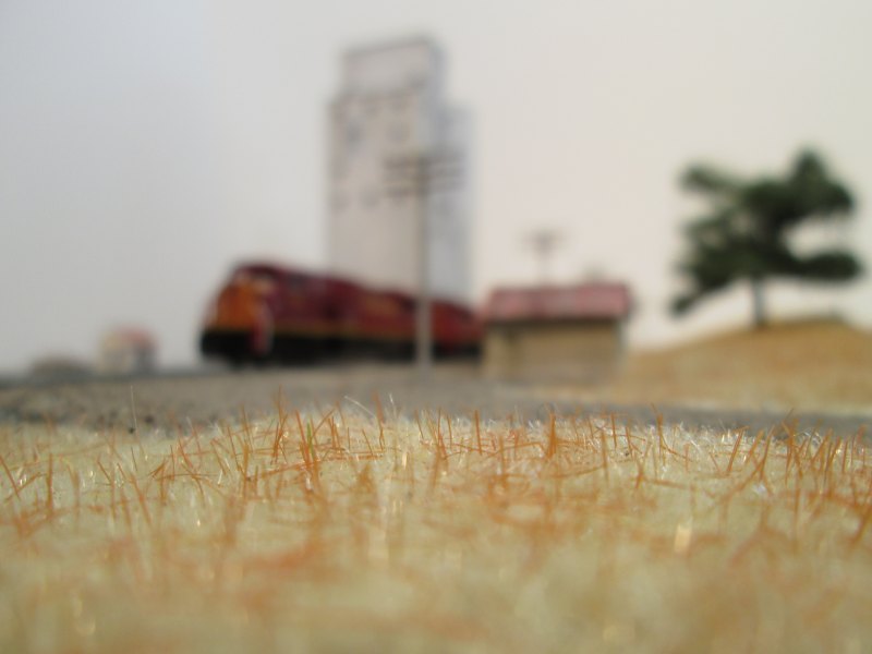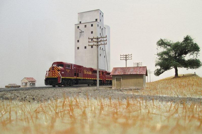 With my shot in hand I headed back home. As I approached the grain elevator near home I heard some scanner chatter from SLRG #115. Great! I stepped on it and set up an intercept course at the railway crossing. It was making good time and I only had time to get a grab shot in the field next to the tracks. Never mind.